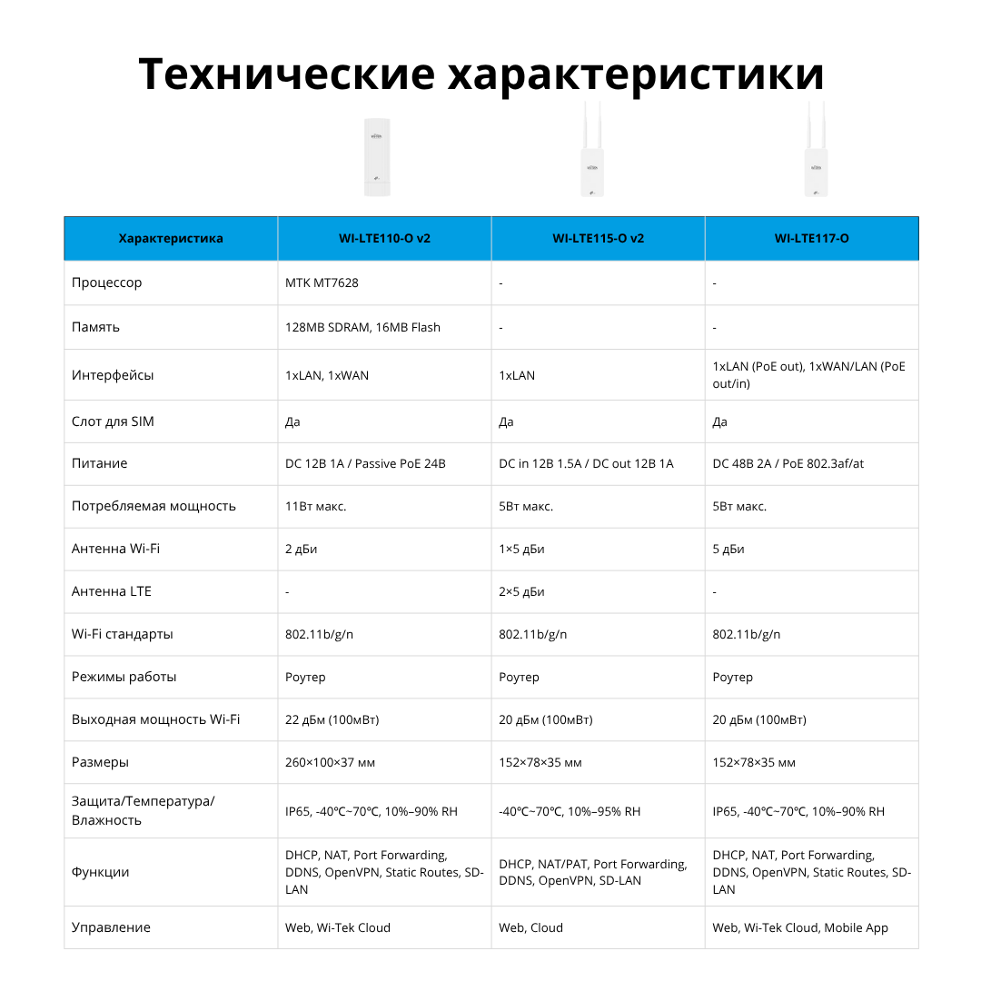 Устройства оснащены встроенными или внешними всенаправленными антеннами, защищены по стандарту IP65, поддерживают централизованное управление через облако Wi-Tek Cloud и работу с аппаратными контроллерами.