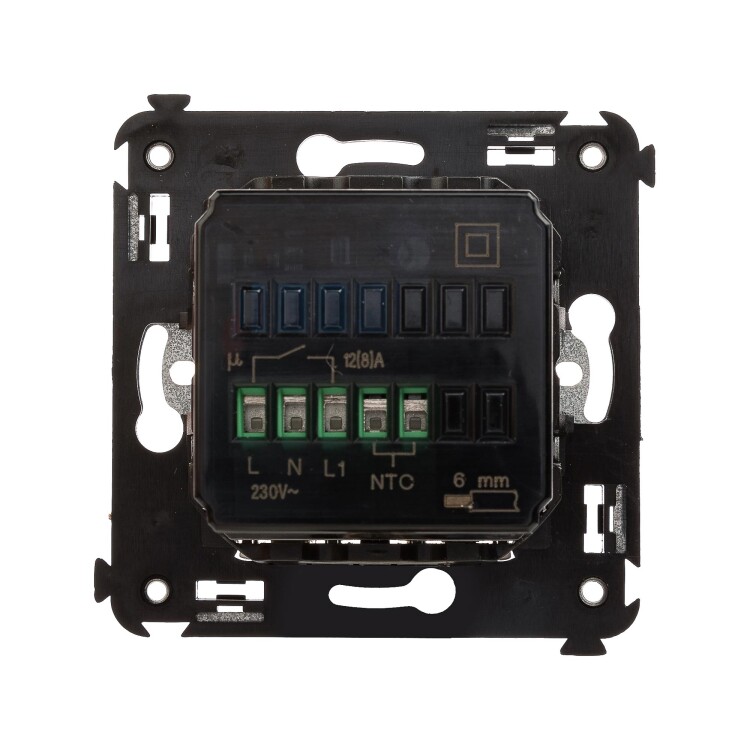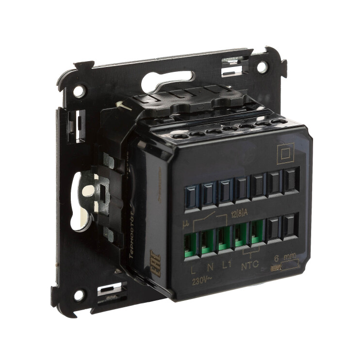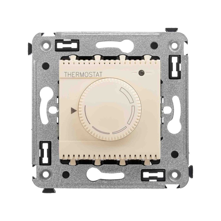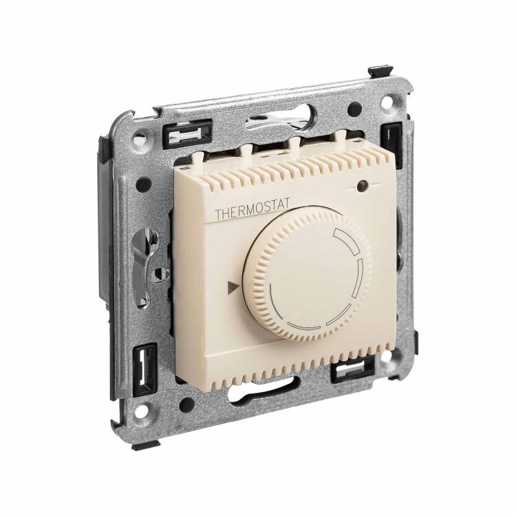 Термостат для теплых полов. Назначение: для монтажа в подрозеточные коробки глубиной не менее 45 мм (код 59301);. Предназначен для управления теплыми полами. Характеристики: диапазон от 5 до 30 °С; частота - 50-60 Гц; номинальное напряжение - 230 В; лампа-индикатор включается, когда температура в комнате падает ниже выбранного значения; нагрузка: 12 A - cos?=1; 4,8 A - cos?=0,4; фиксация в подрозеточные коробки глубиной не менее 45 мм при помощи каркаса с лапками (код 4400802) и саморезов; провод датчика температуры в комплекте (длина 3,5 метра). Цвет: "Ванильная дымка".