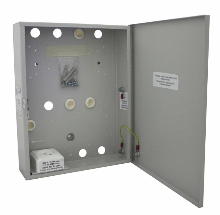Монтажный бокс для установки в нем БПД, БУД, VIZIT-TU, БК. Сетевая розетка. Защитное заземление. Вентиляция. Габаритные размеры 251х321х93. Устанавливается на стену внутри помещения.