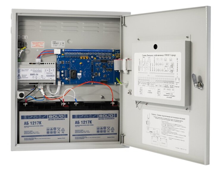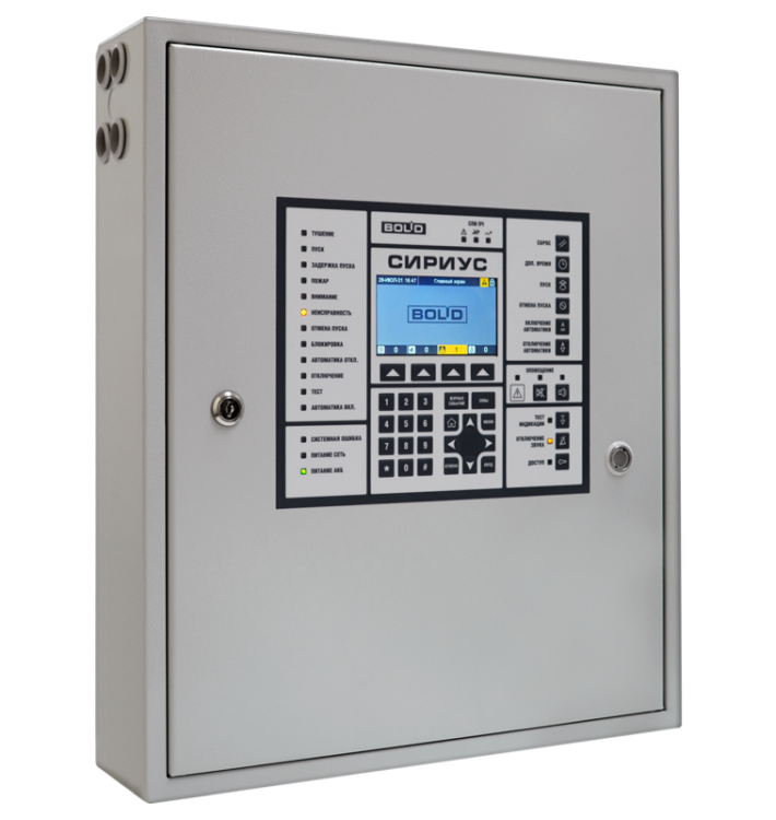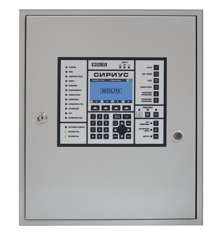 Прибор приемно-контрольный и управления пожарный "Сириус", одна кольцевая линия для подключения до 127 адресных устройств (с возможностью подключения двух кольцевых линий), возможность подключения приборов системы "Орион" по интерфейсу RS485, возможность объединения ППКУ в сеть, встроенный источник питания 24В, 3А с возможностью подключения двух аккумуляторов 12В-17Ач