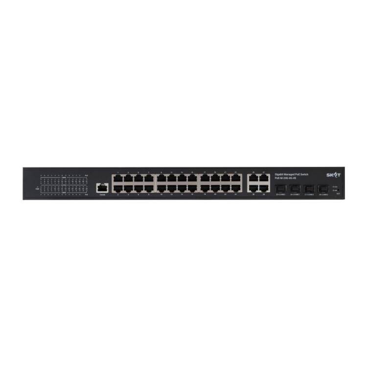 SKAT PoE-M-24G-4G-4S представляет собой специализированный управляемый PoE-коммутатор для построения управляемых сетей уровня L2+ в системах коммутации, видеонаблюдения, IP-телефонии и безопасности.