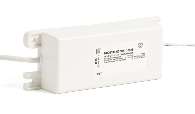 12В, 5А, габариты 150х56х35 мм, защита выхода от КЗ и перегрузки, прочность изоляции 3 кВ, проушины для крепления, корпус IP67
