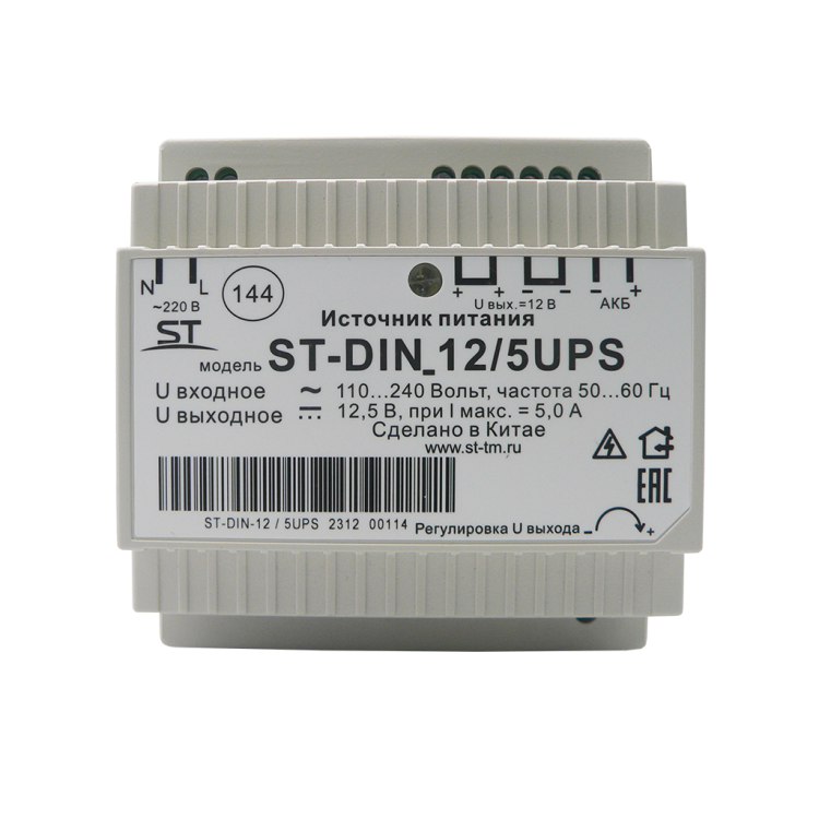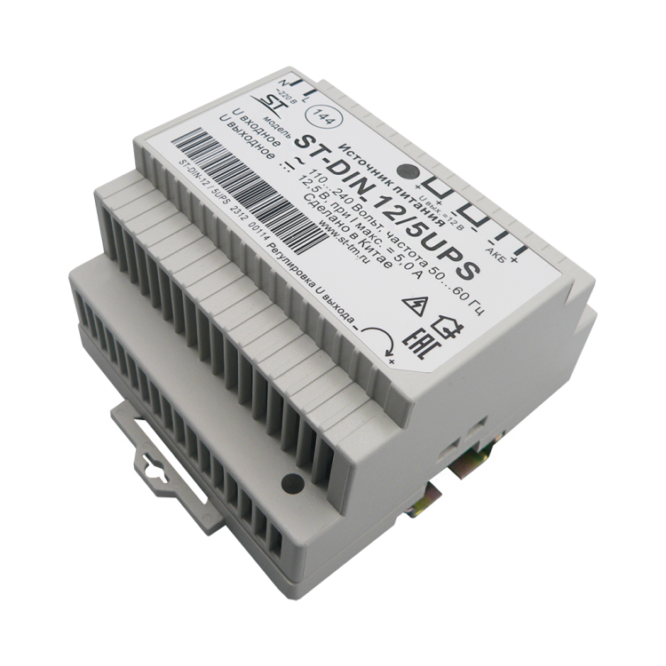 ST-DIN 12/5UPS, Стабилизированный источник питания на DIN-рейке с функцией подключения АКБ для питания аппаратуры напряжением 12В, Защита выхода от КЗ с восстановлением нормального режима работы после устранения проблемы,защита АКБ от глубокого разряда,регулировка выходного напряжения