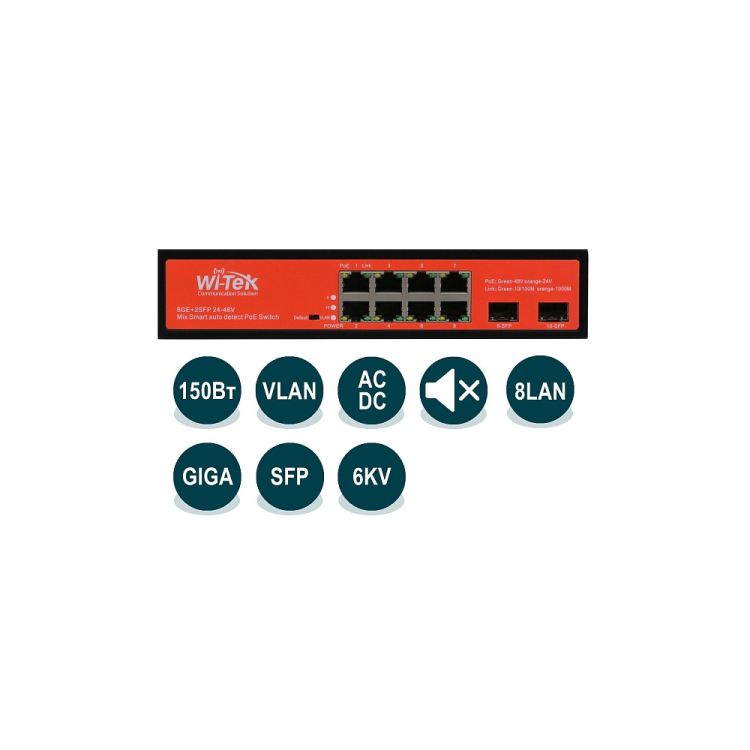Неуправляемый коммутатор 8 PoE порта 1000Base-T + 2 SFP PoE IEEE 802.3at/af до 30Вт на порт режим VLAN на основе порта Внутренний блок питания 150Вт