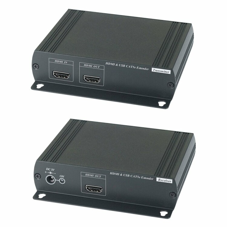 HKM01E HDMI KVM удлинитель (комплект приёмник + передатчик) по сети Ethernet, расстояние "точка-точка" до 150м (CAT5e/CAT6). Позволяет передавать HDMI (1.3b, 1080p, 60Гц), и USB 2.0 (2 порта). Можно использовать совместно с SR01 для увеличения расстояния (без ограничения по количеству). Устройство предназначено для работы с PC и регистраторами на базе ОС Windows/Linux с драйверами для работы USB-хаба. Передатчик: Вх. - HDMI(A)/Роз.2,5х5,5мм(DC5V). Вых. - HDMI(A)/USB(B)/RJ45. Приёмник: Вх. - USB(A)x2/Роз.2,5х5,5мм(DC5V)/RJ45. Вых. - HDMI(A). В комплекте БП DC5V(2А) - 2шт. Размеры каждого устройства (ШxВxГ): 140x30x125мм. Рабочая температура -40…+55°С.