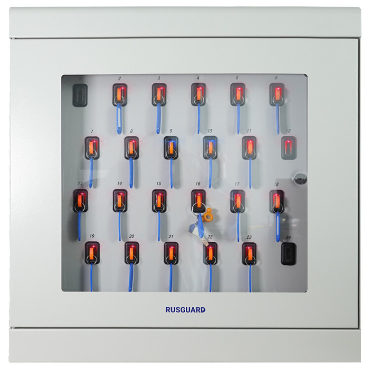 Электронная ключница RUSGUARD KeyKeeper-24 (на 24 ключа). Интерфейсы связи: Ethernet 10/100base-tx; вместимость ключей: 24 шт; питание/потребление: AC 220В, 80 Вт; установка/крепление: кронштейн для установки на стену; температура окружающей среды: -10... +50°C; вес: 34,7 кг; габаритные размеры (ШхВхГ): 64х63х20 см; гарантия: 1 год.