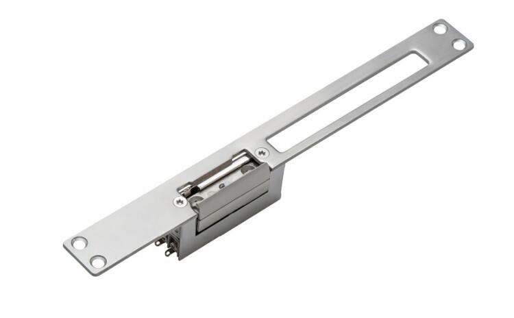 Электрозащелка представляет собой ответную часть замка и состоит из сердечника и обмотки якоря, которая соединена с пружиной сжатия. При подаче напряжения на контакты электрозащелки происходит разблокировка фиксатора, и в этот момент возможно открыть дверь с выдвинутым ригелем механического замка.