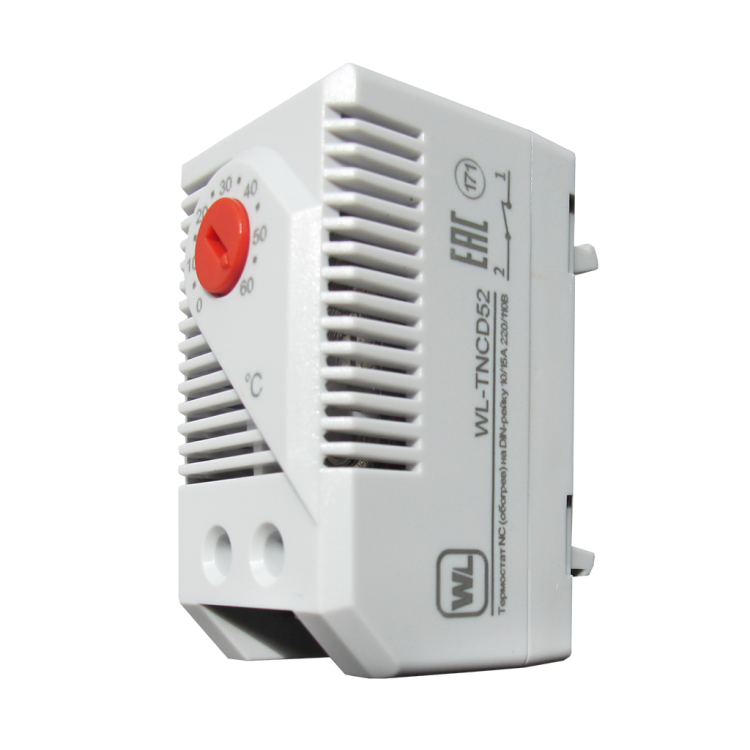 Термостат WL-TNCD52 нормально-замкнутый (терморегулятор) механический предназначен для поддержания фиксированной температуры и предотвращения образования конденсата, коррозии в корпусных изделиях, клеммных коробках. Нормально-замкнутый контакт (NC) используется для регулирования нагревателей., Номинальное напряжение, В: 110, Номинальный ток контактов: 220В: 10А, Чувствительный элемент: биметаллический элемент, Диапазон регулировки температуры: от 0 °С до +60 °С, Срабатывание при отклонении от установленной °t: 5°С (± 4 °С погрешность), Тип контакта: NC, Тип крепления: на DIN-рейку 35мм, Степень защиты: IP20, Рабочая температура: -20°С - +80°С, Материал корпуса: пластик, Цвет корпуса: светло-серый, Габариты изделия, мм: 60х33х43, Комплектация: термостат, паспорт, упаковочная тара