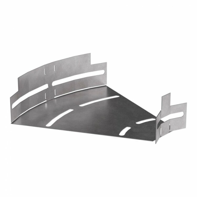Это металлический угол для кабеленесущих лотков, который позволяет плавно менять направление горизонтальной линии в диапазоне от 0 до 45 градусов. Он подходит для прокладки кабельных трасс средней мощности, обеспечивая надежный и аккуратный переход между участками лотков шириной 200 мм и высотой 50 мм.