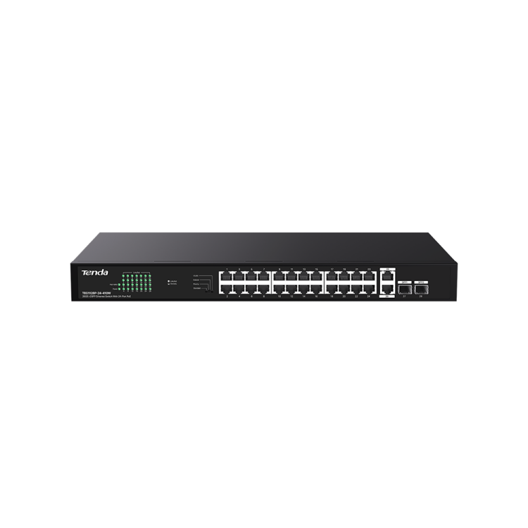 TEG1128P-24-410W - это управляемый коммутатор Ethernet PoE от Tenda. Коммутатор предоставляет 24 гигабитных порта PoE, 2 гигабитных порта RJ45 и 2 порта SFP. Он поддерживает стандарт IEEE 802.3af/at и автоматически обнаруживает PDs и подает питание. Максимальная выходная мощность одного порта составляет 30 Вт, а общая мощность коммутатора - 370 Вт. Он поддерживает монтаж в стойку, настройку одним переключателем, Plug and Play и простое сетевое подключение.