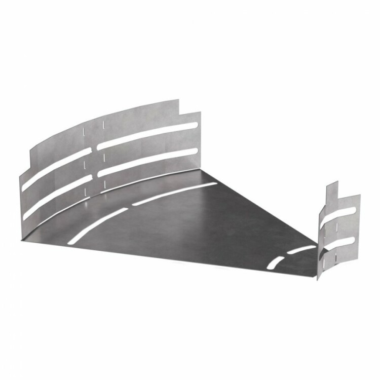 Это металлический угол для кабеленесущих лотков, который позволяет плавно изменять направление горизонтальной линии от 0 до 45 градусов. Он подходит для монтажа кабельных трасс средней нагрузки, обеспечивая аккуратный и надежный переход между секциями лотков размером 300х80 мм.
