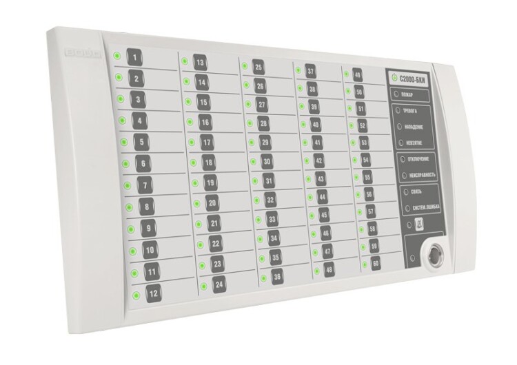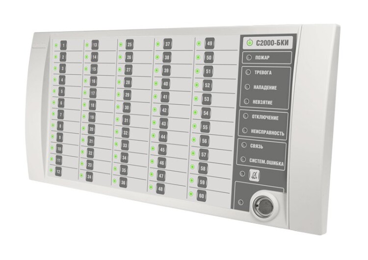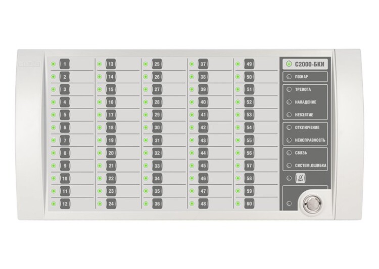 Блок индикации и управления для работы в составе ИСО "Орион", 60 индикаторов состояния разделов, 6 одноцветных индикаторов тревог и неисправностей, 1 индикатор состояния блока, 1 индикатор состояния связи блока с сетевым контролером, 1 индикатор наличия системной ошибки блока, 1 индикатор отключения звука, 1 индикатор состояния доступа к управлению разделами; две линии RS-485, встроенный считыватель TouchMemory, U-пит.10.2...28.4 В, I-потр.200 мА (max), IP20, t-раб.-30...+50°С, 340х170х27 мм