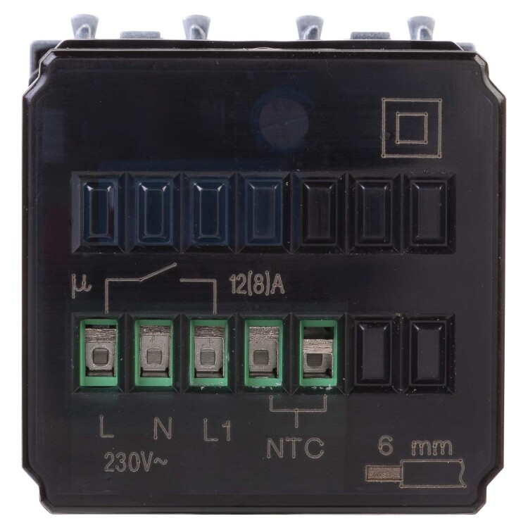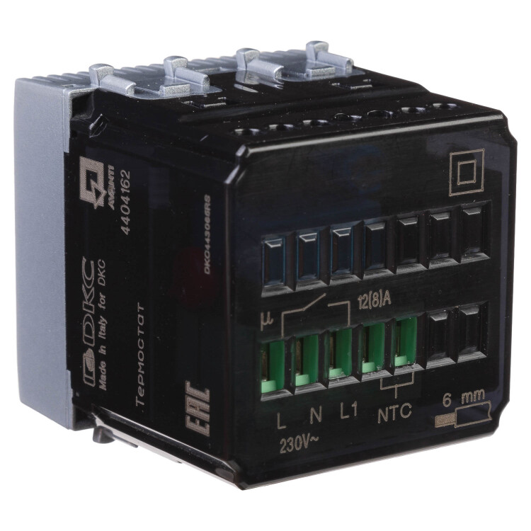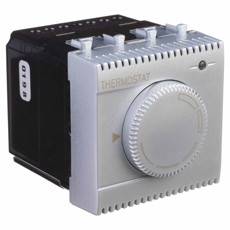 Термостат модульный для теплых полов. Назначение: для монтажа в системы "In-liner Front" и "In-liner Aero" при помощи рамок-суппортов и каркасов "Avanti" (код 4400912 и т.д.); управление теплыми полами. Характеристики: диапазон от 5 до 30 °С; частота - 50-60 Гц; номинальное напряжение - 230 В; лампа-индикатор включается, когда температура в комнате падает ниже выбранного значения; нагрузка: 12 A - cos?=1, 2 A - cos?=0,4; фиксация в подрозеточные коробки глубиной не менее 45 мм при помощи каркаса с лапками (код 4400802) и саморезов. Кол-во модулей: 2. Цвет: "Закаленная сталь".