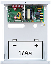 12В, 6А, кратковременно и в режиме резерва до 6,5А, корпус под АКБ 17Ач, диапазон входного напряжения 170-242В;