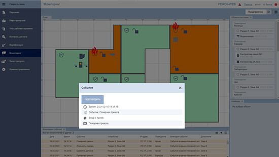 - мониторинг состояния и управление устройствами ОПС «Болид» в интерфейсе системы контроля доступа PERCo-Web;