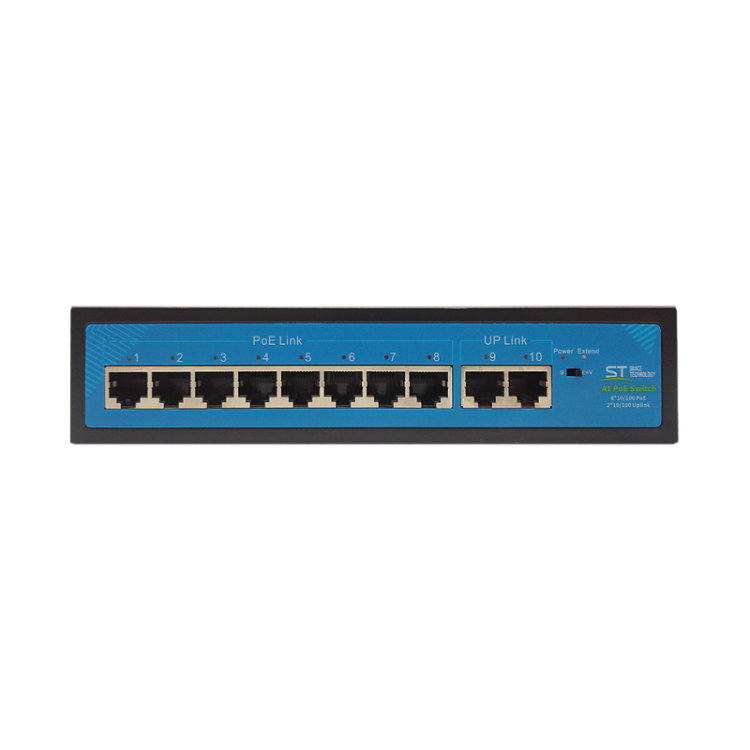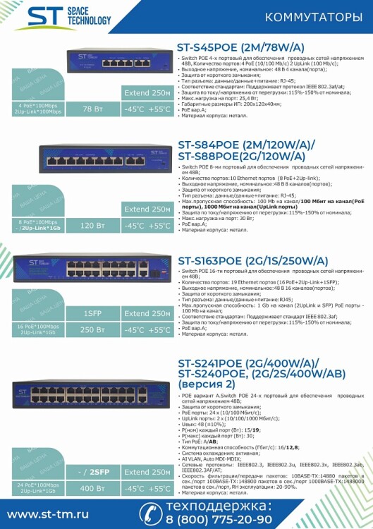 Источник питания ST-S84POE (2M/96W/A), (версия 3), Switch POE 8-ми портовый для обеспечения проводных сетей напряжением 48В, PoE порты: 8 х (10/100 Мбит/с), UpLink порты: 2 х (10/100 Мбит/с), Max.пропускная сп-ть: 100 Мбит/канал, Р(ном) каждый порт (Вт): 12 Вт, Р(макс) каждый порт (Вт): 30 Вт, Тип РоЕ: А, защита от КЗ, Extend 250м., VLAN