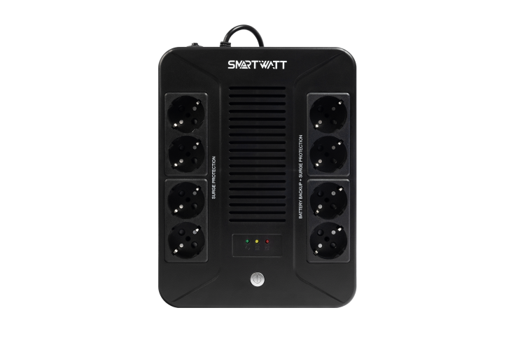UPS SAFE PRO 600 от SmartWatt - это источник бесперебойного питания для защиты средней нагрузки, подходящий для одного-двух рабочих мест или офисной техники. Он обеспечивает стабильную подачу энергии при перепадах напряжения в диапазоне от 145 до 295 В, сохраняя работу оборудования при кратковременных отключениях благодаря встроенному аккумулятору.