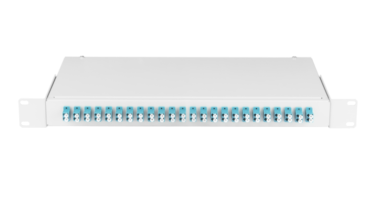 Оптический кросс 19", 1U, укомплектованный на 48 портов LC/UPC(24 двойных LC/UPC адаптера), SM 9/125 OS2, стальной, серый, в комплекте: адаптеры, монтажные шнуры 1м, сплайс-кассеты с крышкой, гильзы
