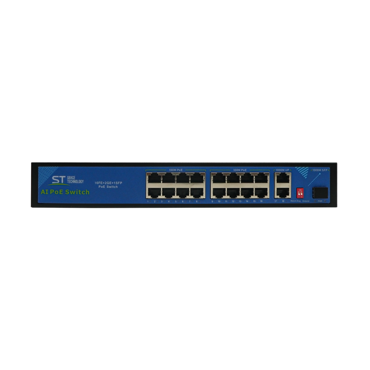 Источник питания ST-S165POE(2G/1S/250W/A)PRO, (версия 2), Switch POE 16-ти портовый,для обеспечения проводных сетей напряжением 48В, PoE порты: 16 х (10/100 Мбит/с), UpLink порты: 2 х (10/100/1000 Мбит/с), SFP порты: 1 х (10/100/1000 Мбит/с), Max.пропускная сп-ть: 100 Мбит/канал (PoE порты), 1000Мбит/канал (UpLink и SFP порты), Р(ном) каждый порт (Вт): 15,6 Вт, Р(макс) каждый порт (Вт): 30 Вт, Тип РоЕ: А, защита от КЗ, Extend 250м., AI PoE, AI VLAN, Грозозащита, ПП №969
