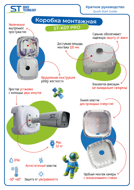 Монтажная коробка ST-K07 PRO (ЧЕРНАЯ) , Универсальная монтажная коробка для видеокамер охранного наблюдения, предназначена для установки и подключения видеокамер охранного видеонаблюдения, Габаритные размеры: 140х140х66 мм, Максимальная нагрузка: 2,5 кг, Пластик, Цвет: черный, Рабочая температура: -50…+60°С, Степень защищенности: IP 65, Вес нетто: 0,23 кг
