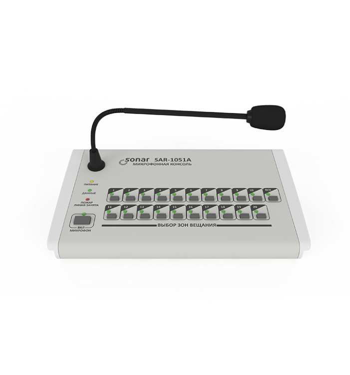 Пульт микрофонный с селектором на 20 зон оповещения. Подключается к SRG-3220. Индивидуальный выбор зон или включение всеx, звуковой сигнал, подавление обратной связи, встроенный микрофон на гибком держателе. Для работы несколькиx пультов используется блок SDR-1104. Удаленность до 100 м.