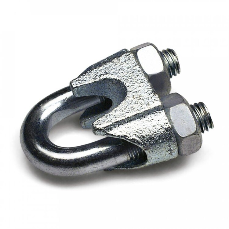 Зажим для каната 4 мм представляет собой U-образную шпильку, зажимающий элемент и две шестигранные гайки. Трос продевается в u-образный болт и зажимается элементом при затягивании гаек.