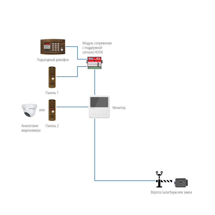 Видеодомофон полностью адаптирован для работы с подъездными домофонами типа Vizit, Cyfral, Eltis, Метаком, Сейф-Сервис, Даксис, Proel, Laskomex, Keyman-Polylock и Маршал-Raikmann через модуль сопряжения с сигналом HOOK.