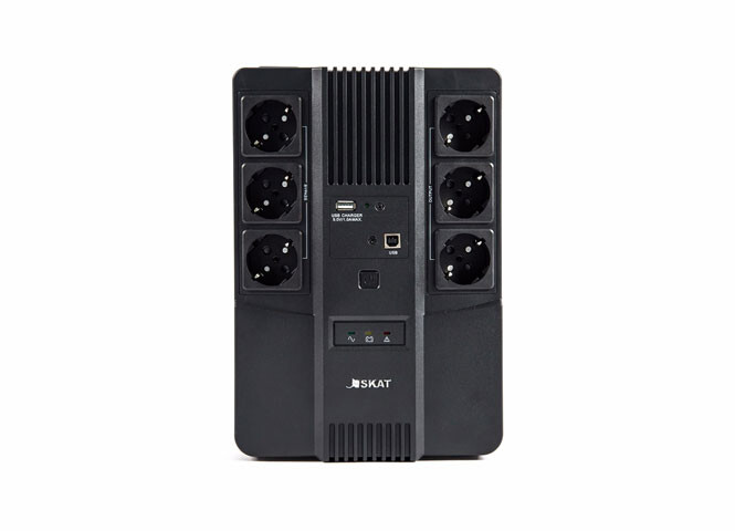 220В, 800 ВА, (480 Вт), встроенный АКБ 9Ач, время резерва 3 мин., холодный старт, модифицированный синус, световая и звуковая индикация режимов работы, связь и управление ПК по USB. Встроенный стабилизатор (диапазон сети 170-270В), защита от всплесков напряжения, защита от перегрузки. 6 выходных разъема: 3 шт. CEE 7/4 (розетка с заземлением) с питанием от АКБ, 3 шт. CEE 7/4 (розетка с заземлением) без питания от АКБ