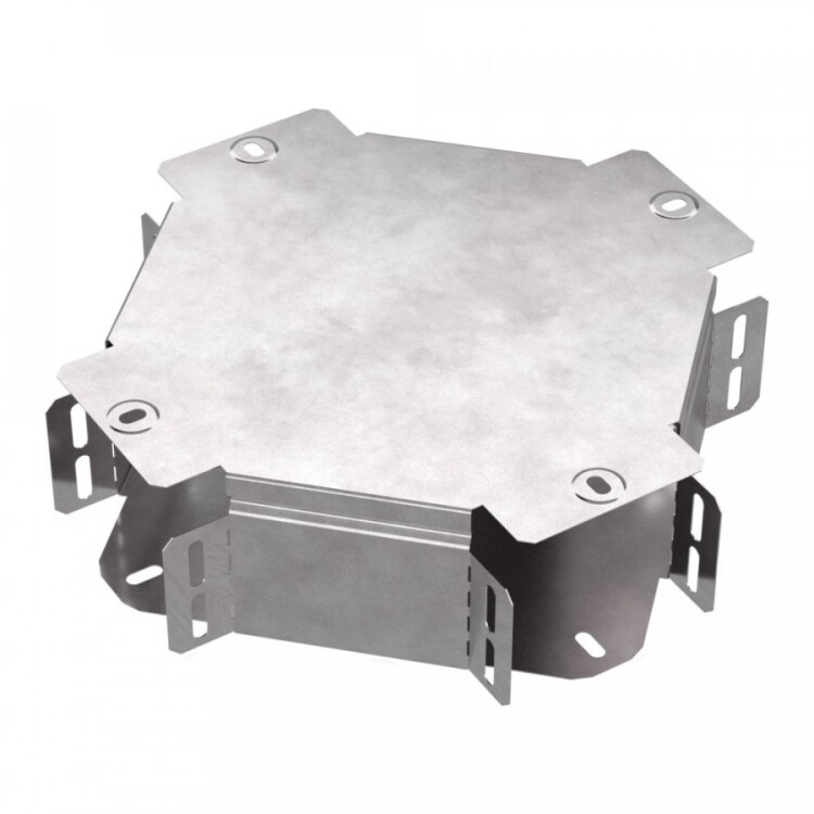 Изготовлен из оцинкованной стали с прочным цинковым покрытием 19-23 мкм по методу Сендзимира, что гарантирует долговечность и защиту от коррозии. В комплект входит крышка, которая обеспечивает защиту и безопасное закрытие ответвления, упрощая монтаж и обслуживание кабельных трасс.