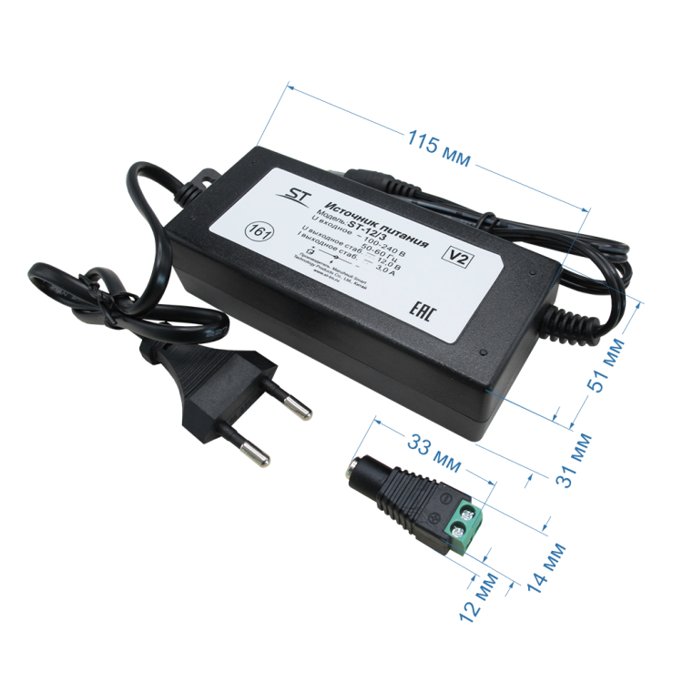 ST-12/3 , (версия 2), Стабилизированный источник питания,макс. 3,0 А -12В, Защита выхода от КЗ с восстановлением нормального режима работы после устранения проблемы