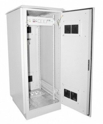 Шкаф уличный напольный климатический 19", 42U, Ш715xВ2100хГ860мм, две пары монтажных направляющих, передняя и задняя металлическая дверь с пятиригельным замком, два вентилятора и два фильтра, обогреватель 400Вт, датчик открытия двери - 2шт., термостат - 2шт., электрическая распределительная панель 3U с DIN рейкой с установленным автоматическим выключателем 1Р16А - 1шт. и 1Р6А - 2шт. и с установленной розеткой 16А, герметичные кабельные вводы D=32мм - 8шт., класс защиты IP55, цвет серый RAL 7035