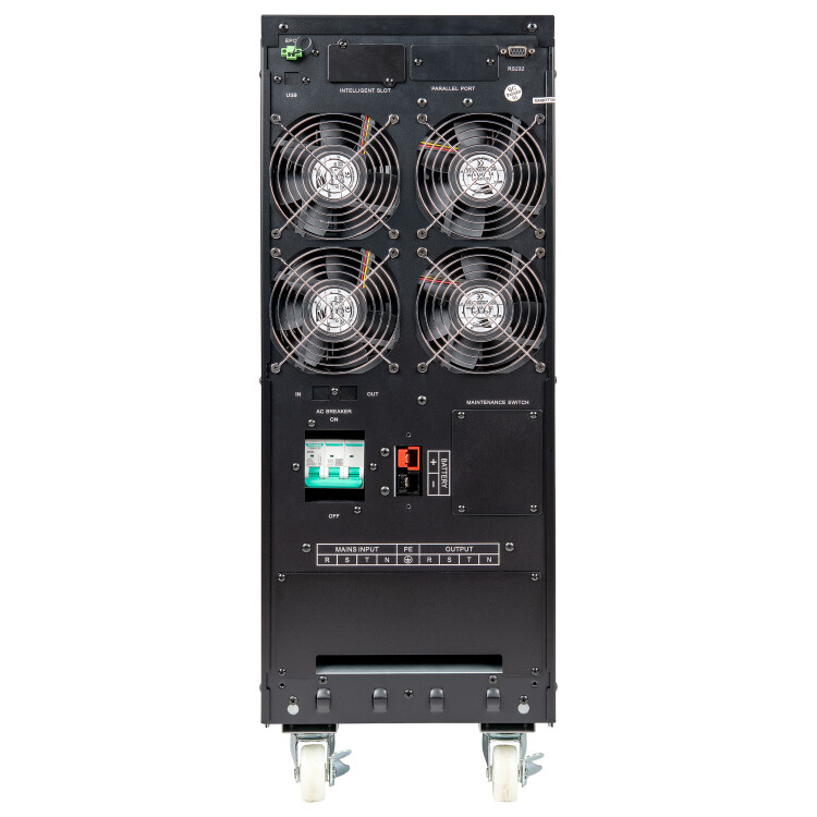 Модель оснащена удобным LCD дисплеем для контроля состояния и портами связи RS232 и SNMP, что позволяет интегрировать ИБП в системы мониторинга. Напольный корпус и клеммная колодка упрощают монтаж в технических помещениях, а наличие функции аварийного отключения (EPO) повышает безопасность эксплуатации. В комплекте поставляется без аккумуляторов, что даёт возможность выбрать оптимальные батареи под конкретные задачи.