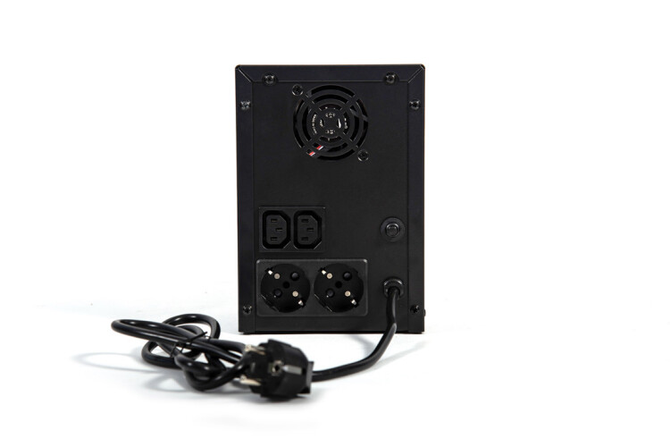 220В, 3000 ВА, (1800 Вт), встроенный АКБ 7Ач, 4 шт., время резерва 1,5 мин., холодный старт, модифицированный синус, световая и звуковая индикация режимов работы. Встроенный стабилизатор (диапазон сети 162-290В), защита от всплесков напряжения, защита от перегрузки. 4 выходных разъема: 2 шт. IEC 320 C13 (компьютерный), 2 шт. CEE 7/4 (розетка с заземлением)