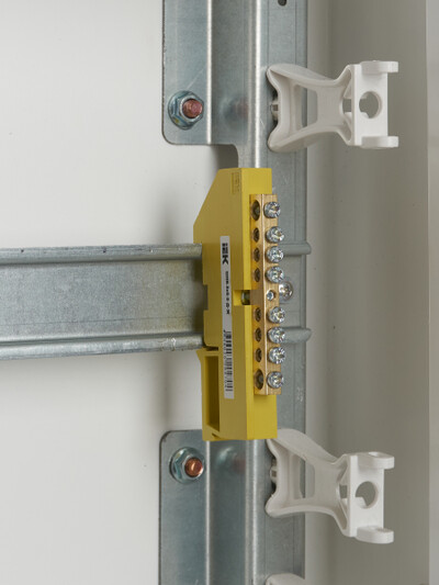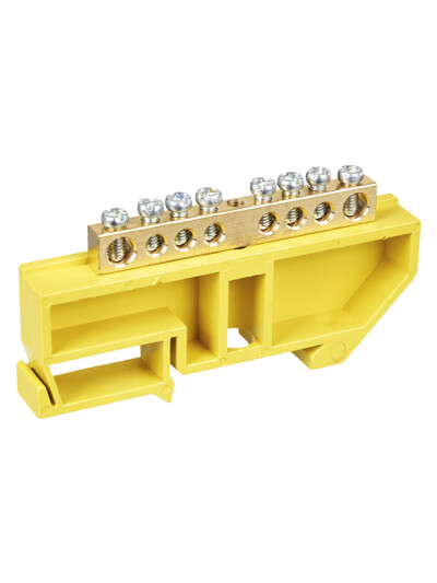 Шина PE "земля" на DIN-изол ШНИ-6х9-8-Д-Ж ИЭК Применяются в щитовом оборудовании для подсоединения нулевых рабочих (N) и нулевых защитных проводов (РЕ). Крепление шины предусмотрено по центру (типы 8/1, 14/1) и по краям (типы 8/2 и 14/2) через изолятор нулевой шины на 35 мм монтажную DIN-рейку и через угловые изоляторы нулевой шины, а также непосредственно на панель щита. При подключении к шинам медных многожильных проводов рекомендуется оконцевание их наконечниками-гильзами. Выполнены из латуни.