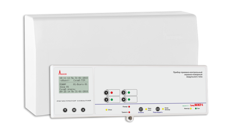 ППКОП 4ШС с выносной клавиатурой до 500 м, до 5 клавиатур, напряжение шлейфа 17...20В, ток в шлейфе сигнализации в дежурном режиме 1,5 мА, RS-485, подключение модуля Ethernet (СА+LAN), 3 переключаемых выхода типа «сухие контакты», 4 выхода типа «открытый коллектор», напряжение питания 220 В, ток потребления 0,13 А, под аккумуляторную батарею 12 В / 7 Ач, диапазон рабочих температур -30...+55°С, габаритные размеры системного блока 345х180х90 мм