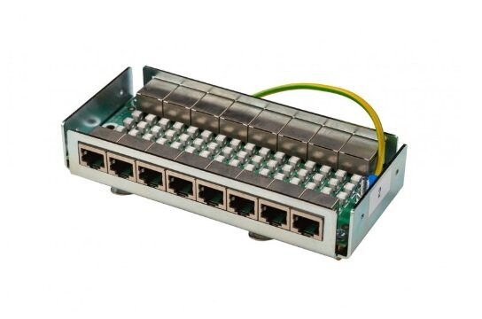 Устройство грозозащиты для локальной вычислительной сети с защитой линий PoE (IEEE802.3af/at/bt до 60Вт), вход 8xRJ-45 10/100/1000 Мбит/с, выход 8xRJ-45 10/100/1000 Мбит/с; монтаж на DIN-рейку; -60…+50°C; 160х70х40 мм