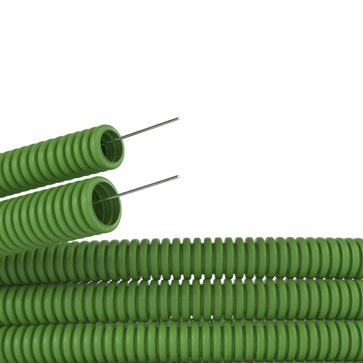 Диаметр - 20 мм. Материал - самозатухающий поливинилохлорид (ПВХ). Цвет - зеленый. Гофрированные трубы из ПВХ легкой серии могут эксплуатироваться при температуре от - 25 °С до + 60 °С. Длина - 100 метров.