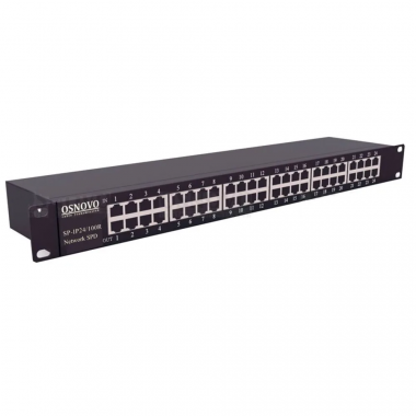 Устройство грозозащиты для локальной вычислительной сети (скорость до 100 Мбит/с) на 24 порта. Двухступенчатая защита. Максимальное длительное рабочее напряжение (Uc) 6V. Номинальный ток разряда (8/20 мкс, In) 2,5kA. Суммарный ток разряда (8/20 мкс, Itotal) 10kA. Время отклика не более 1 нc. 24 входов (RJ45-мама), 24 выходов (RJ45-мама). Монтаж в 19" стойку (1U). Размеры (ШхВхГ): 487x44,5x102мм. Рабочая температура: -40…+80°С.