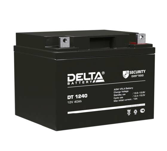 Свинцово-кислотные аккумуляторы DELTA серии DT специально разработаны для применения в слаботочных системах и оптимизированы для работы в буферном режиме. Изготавливаются по технологии AGM. Технические характеристики: номинальное напряжение 12В; срок службы 7-10 лет; номинальная емкость (25°С) 20 часовой разряд - 40 Ач, 10 часовой разряд - 38,2 Ач, 5 часовой разряд - 36 Ач; внутреннее сопротивление полностью заряженной батареи (25°С) - 7 мОм; саморазряд 3% емкости в месяц при 25°С; макс.разрядный ток (25°C) 530 А (5с); рабочий диапазон температур: разряд -15~50°C; заряд -10~50°C; хранение -20~50°C; зарядные параметры: циклический режим (2,35?2,4 В/эл) - температурная компенсация 30 мВ/°С; буферный режим (2,25?2,3 В/эл) - температурная компенсация 20 мВ/°С; габариты (±2мм): длина 196 мм; ширина 166 мм; высота 173 мм; полная высота 173 мм