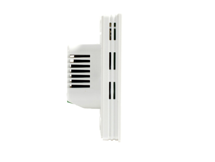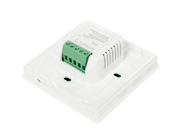 Встраиваемый программируемый комнатный термостат. Питание от сети 220В. Контакты реле до 250В, 3А. Температура регулировки от 5°С до 50°С. Точность регулировки 0,5°С. Встраиваемый корпус в подрозетник. Прямое управление термоприводом и котлом. Большой LCD дисплей. Индикация температуры в помещении. Индикация состояния котла. Калибровка температуры. Установка индивидуальной программы для будних и выходных дней. Установка ограничения максимальной и минимальной температуры. Установка яркости дисплея. Функция защиты системы от замерзания. Работа с нормально открытыми и нормально закрытыми термоприводами