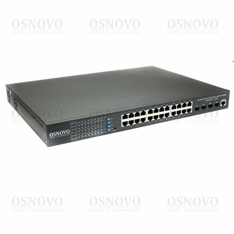SW-24G4X-1L Управляемый L3 PoE коммутатор на 24xGE RJ-45 c PoE + 4х10G SFP+ порта. Порты: 2 x GE (10/100/1000 Base-T) с PoE (до 90W, A+B) + 22 x GE (10/100/1000 Base-T) с поддержкой PoE (IEEE 802.3af/at), 4 x 1/10G SFP+ Uplink. Консольный порт. Соответствует стандартам PoE IEEE 802.3af/at/bt. Автоматическое определение и режим антизависания PoE устройств. Мощность PoE на порт - до 30W. Суммарная мощность PoE до 400W. Поддержка режима CCTV: Увеличение расстояния передачи данных и питания до 250м, изоляция портов (VLAN). Встроенная грозозащита 3kV на порт. Питание: AC90-253V (410W). Встроенный БП. Монтаж в 19 - дюймовую стойку, крепление в комплекте. Размеры (ШхВхГ): 440x45x290мм. Рабочая температура: -20…+55°С.