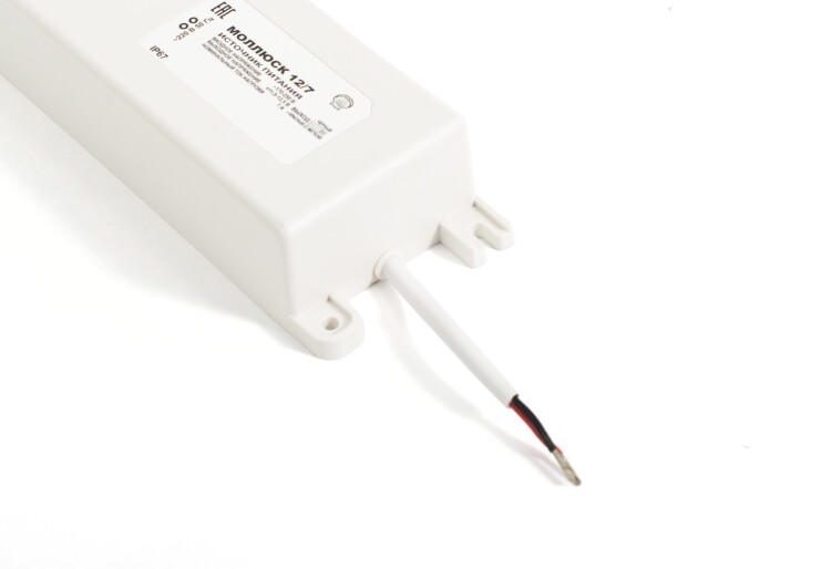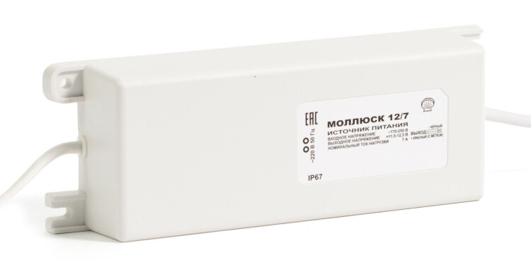 12В, 7А, габариты 205х70х40 мм, защита выхода от КЗ и перегрузки, прочность изоляции 3 кВ, проушины для крепления, корпус IP67
