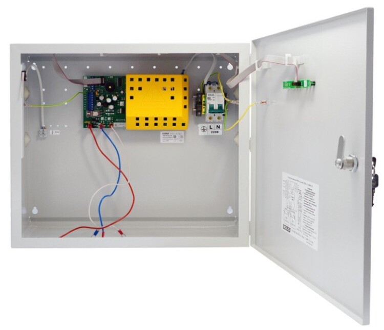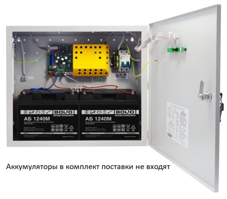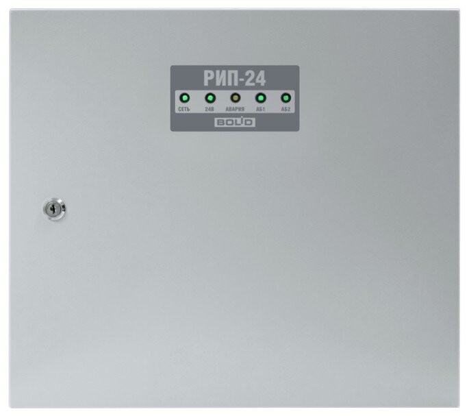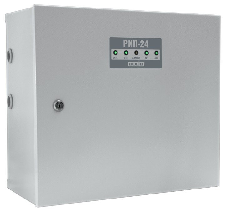 Резервированный источник питания с микропроцессорным управлением, 24 В, 4 А (10 мин-5 А), световая и звуковая индикация режимов, возможность установки двух аккумуляторов по 26 или 40 Ач, защита от переразряда, контроль сетевого, выходного и напряжения батареи. Крышка под замок