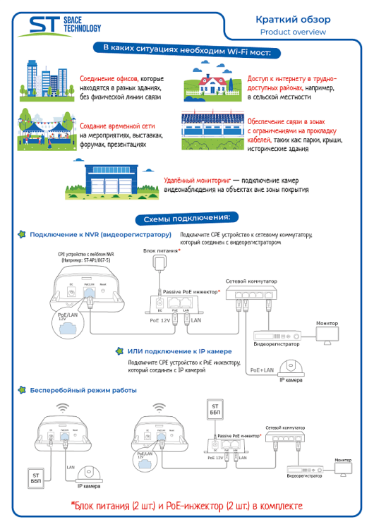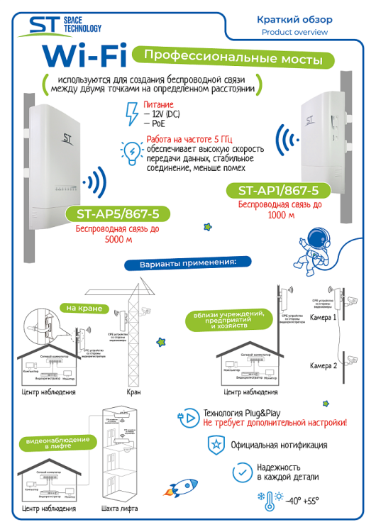 Беспроводная точка доступа ST-AP5/867-5 (Комплект 2 шт.), WI-FI мост предназначен для организации беспроводного интернет трафика на различных расстояниях, Стандарт сети: WiFi IEEE 802.11a/n/ac, рабочая: -30? С ~ 60? С; хранения: -40? С ~ 70? С, 193х109х61