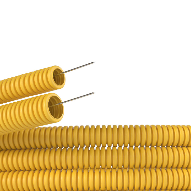 Диаметр - 20 мм. Материал - самозатухающий поливинилохлорид (ПВХ). Цвет - желтый. Гофрированные трубы из ПВХ легкой серии могут эксплуатироваться при температуре от - 25 °С до + 60 °С. Длина - 100 метров.