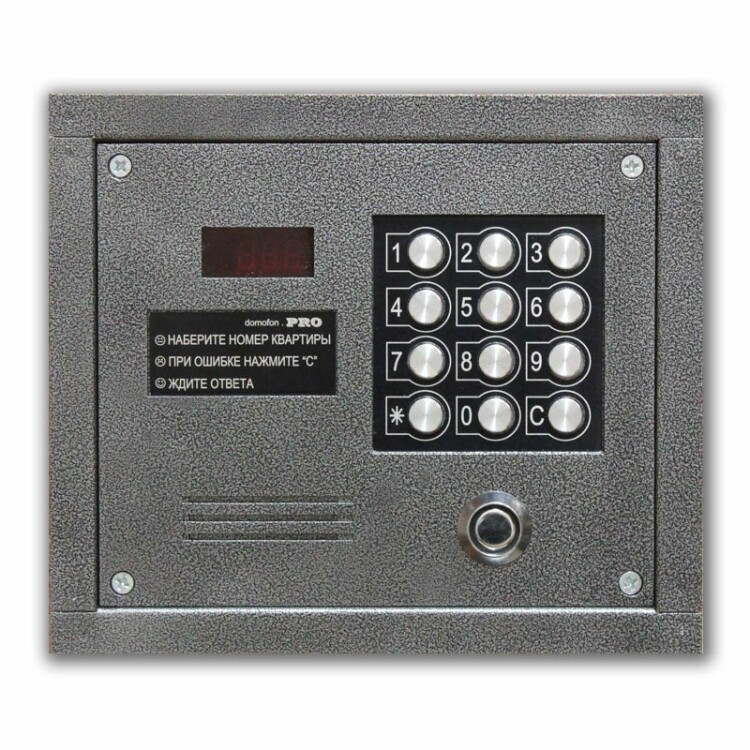 Многоабонентский аудио блок вызова с цифровой адресацией, моноблок (блок вызова + блок электроники), до 255 абонентов, считыватель Touch Memory, до 1000 ключей, защита контактора от разряда высокого напряжения, трёхразрядная индикация, кнопочная клавиатура с подсветкой, встроенная схема размагничивания электромагнитного замка, врезной, 15 В, 0,3 А, 210х180х35 мм, -40...+50°C, серебряный антик