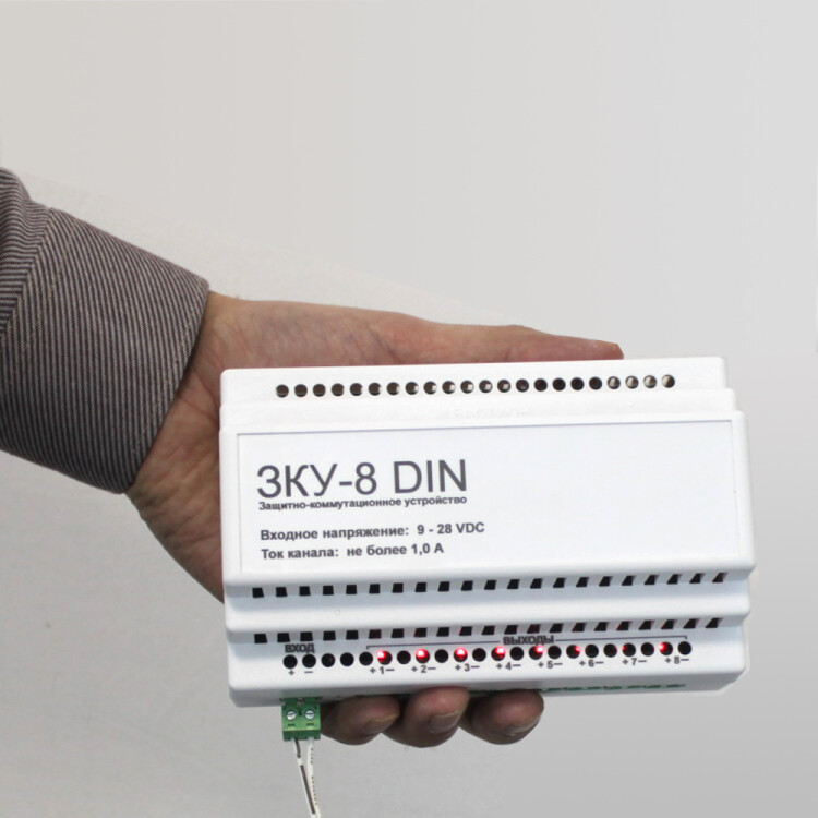 Защитно-коммутационное устройство для коммутации и защиты от КЗ линии питания 9-28 В, 8 каналов по 1 А; быстроразъемные клеммы для удобства монтажа; самовосстанавливающиеся предохранители в каждом канале, индикация по каждому каналу. Малогабаритный корпус на DIN рейку