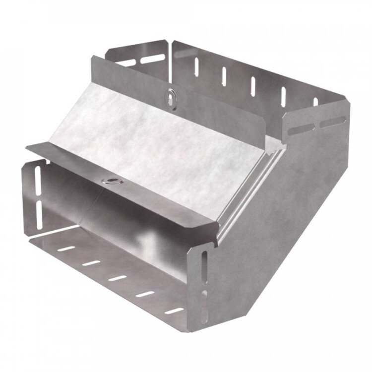 Метод Сендзимира, применённый при изготовлении из оцинкованной ленты, обеспечивает высокую прочность и устойчивость к механическим повреждениям. Такой угол особенно удобен для монтажа в сложных кабельных системах, где требуется надежное и эстетичное изменение направления трассы с сохранением защиты кабелей.