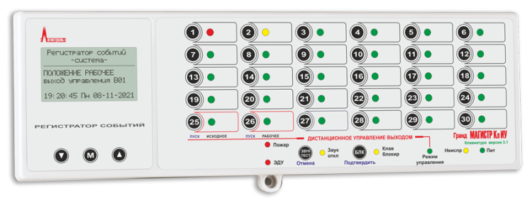 Блок клавиатуры для контроля и управления состоянием клапанов дымоудаления или огнезадерживающих клапанов и других исполнительных устройств, подключенных к выходам управления блоков ключей Гранд МАГИСТР БК-1 или Гранд МАГИСТР БК-2; до 30 контролируемых выходов управления; RS-485;U-пит.12 В, I-потр.40 мА; IP50, t-раб.+5...+55°С, 295х95х32 мм
