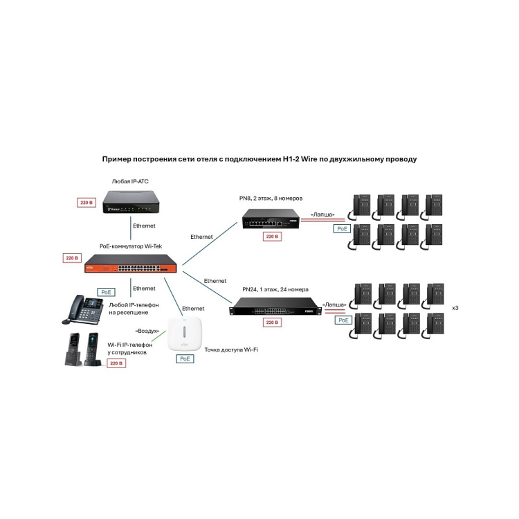 Fanvil PN24 - шлюз (коммутатор) для подключения к любой IP-АТС по 2-жильному проводу ("лапше") до 24 шт. специальных телефонов Fanvil. Представлены 2 модели специализированных телефонов для такого подключения - H1-2 Wire и X303-2 Wire.